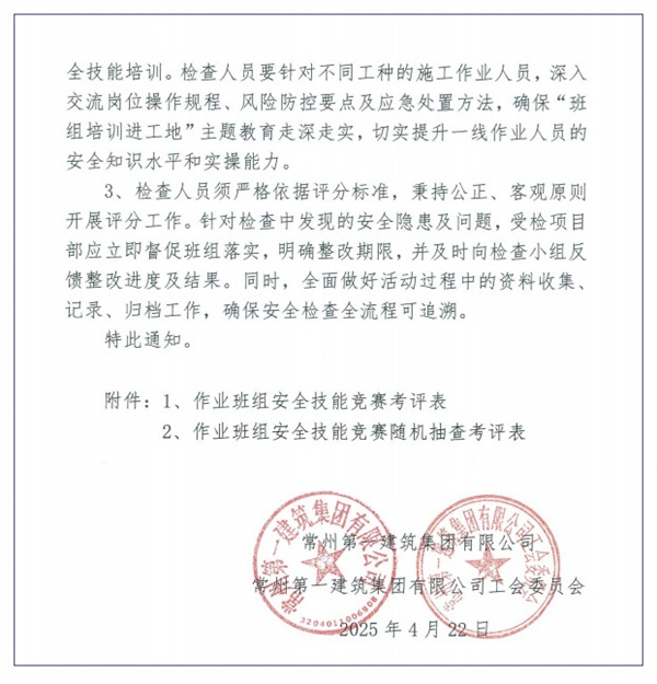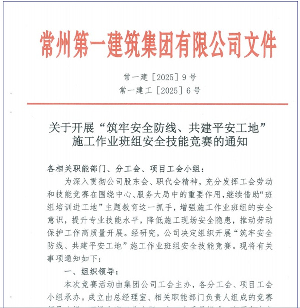 本次竞赛是常州一建集团在2024年开展“劳动焕新· 竞赛赋能”安全生产班前会技能竞赛基础上的一个延伸。内容从班组晨会扩展到班组的整个安全行为,重点是查找身边的安全隐患,筑牢施工现场的安全防线。